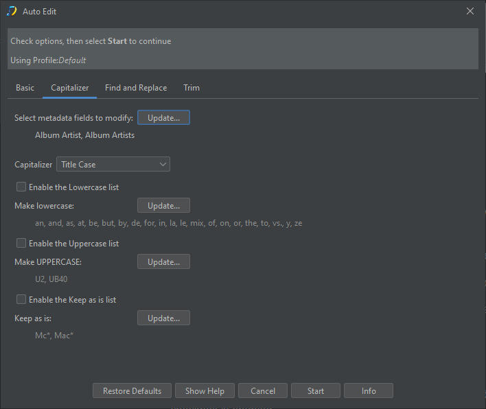 Then additionally we have three special lists that can be applied to the capitalization if their associated checkbox is enabled Make lowercase, Make UPPERCASE and Keep as is