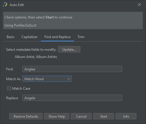 For example in the screenshot we are using to fix a common misspelling of persons name. So we are searching the Album Artist and Album Artists fields for the word Angelea and replacing with the word Angela. Because Match As is set to Match Word the input string is split into words (i.e characters separated by spaces and tabs) and the match is applied to each word.