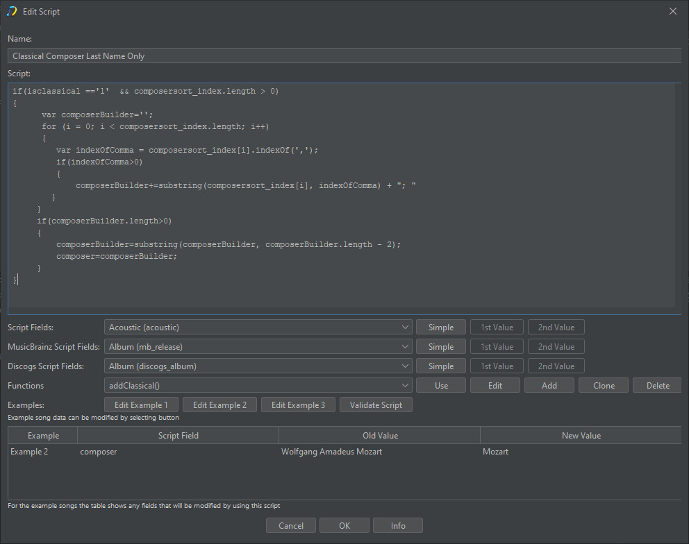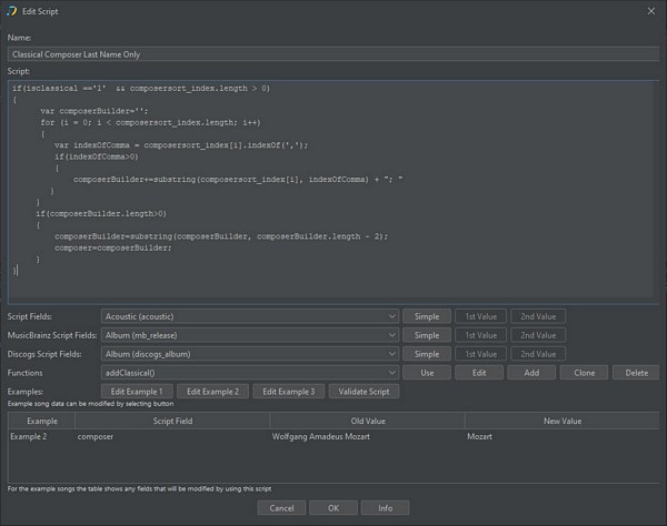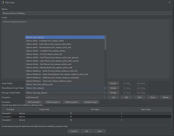 SongKong Scripter allows us to use Javascript to modify metadata fields to new values based on other fields. Because we use the Javascript this gives access to a huge number of functions giving more power and flexibility than simple scripting languages included as part of other tag editors. SongKong comes with a number of default scripts that can be used for common tasks or as part of a larger script.