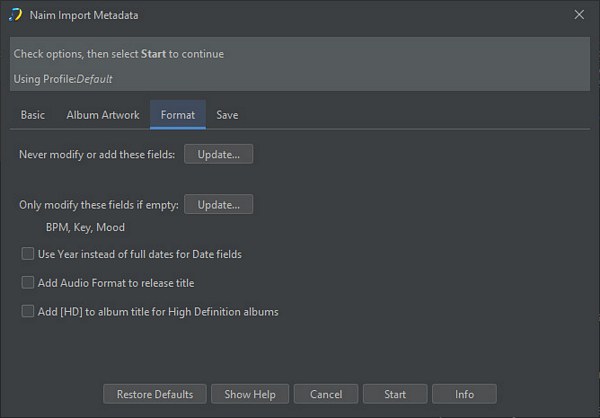 With the Naim Import Metadata task it can read all these files and then the metadata is now automatically embedded into the Wav files themselves, this can now be read and used by most applications and players. Because the files are local and no searching on the Internet is required this process is extremely fast.